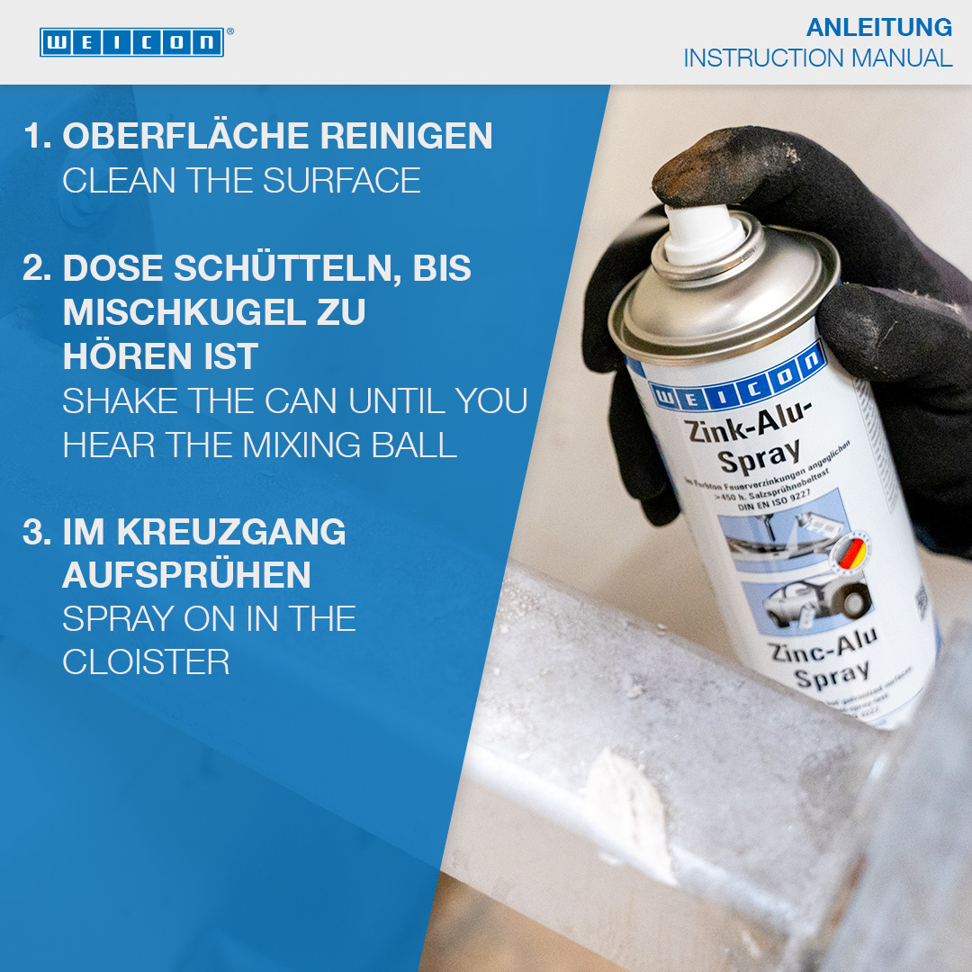 WEICON 징크-알루 스프레이는 모든 금속 표면을 녹과 부식으로부터 영구적으로 보호합니다. 빠르게 건조되고 밀착되는 보호막을 형성하며 많은 화학 물질에 대한 내성이 있습니다. 아연-알루 스프레이는 용융 아연 도금 부품을 일치하는 색상으로 수리하고 용접 조인트 및 드릴 구멍을 코팅하는 데 사용할 수 있습니다.