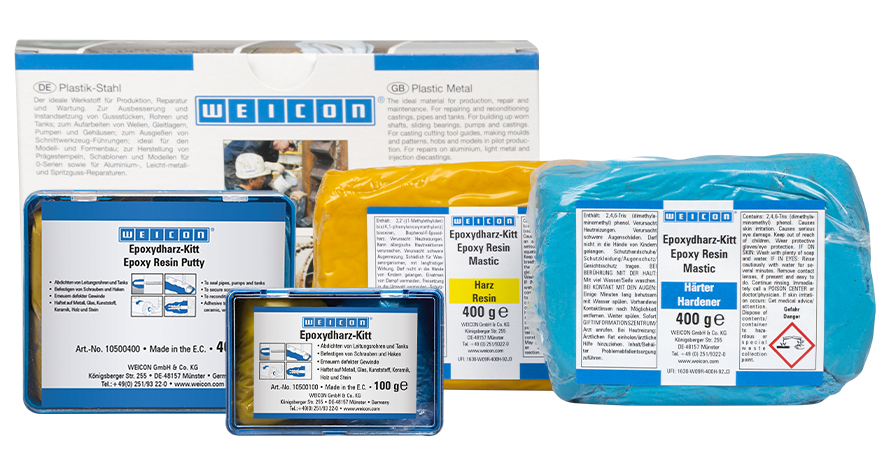 웨이콘 에폭시 수지 퍼티는 금속이 없는 반죽 가능한 2성분 화합물입니다. 이 제품은 다양한 용도로 사용할 수 있습니다. 주물의 리컨디셔닝 및 수리, 샤프트, 슬라이드 베어링, 펌프 및 하우징의 재건, 결함이 있는 나사산의 재생, 템플릿 및 모델 제작, 알루미늄, 경금속 및 사출 성형 부품의 수리 작업에 적합합니다. 이 컴파운드는 파이프와 탱크를 밀봉하고 나사와 후크를 고정하는 데 사용할 수 있습니다. 부식 손상과 구멍을 제거하거나 구멍과 블로우홀을 수리하는 데 사용할 수 있습니다. 에폭시 수지 퍼티는 특히 모든 금속과 세라믹, 유리, 석재, 콘크리트, 목재, 고무 및 많은 플라스틱에 잘 접착됩니다. 경화되면 웨이콘 에폭시 수지 퍼티는 기계 가공이 가능하고 페인트 칠이 가능하며 휘발유, 오일, 에스테르, 소금물 및 대부분의 산과 알칼리에 대한 내성이 있습니다. 최대 +200 °C(+392 °F)의 고온 저항성을 가지며 자성이 없고 부식성이 없습니다. 무게와 부피 기준 1:1의 간단한 혼합 비율로 인해 수지와 경화제를 원하는 양만큼 매우 쉽게 나누어 사용할 수 있습니다. 웨이콘 에폭시 수지 퍼티는 기계 제작, 공구 제작, 모형 및 금형 제작 및 기타 여러 산업 분야에 사용할 수 있습니다.