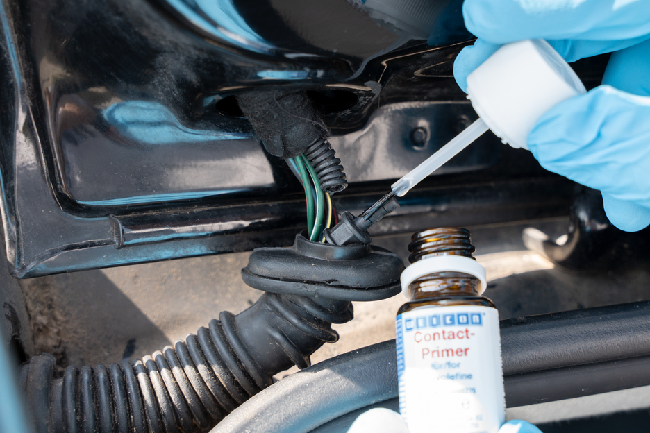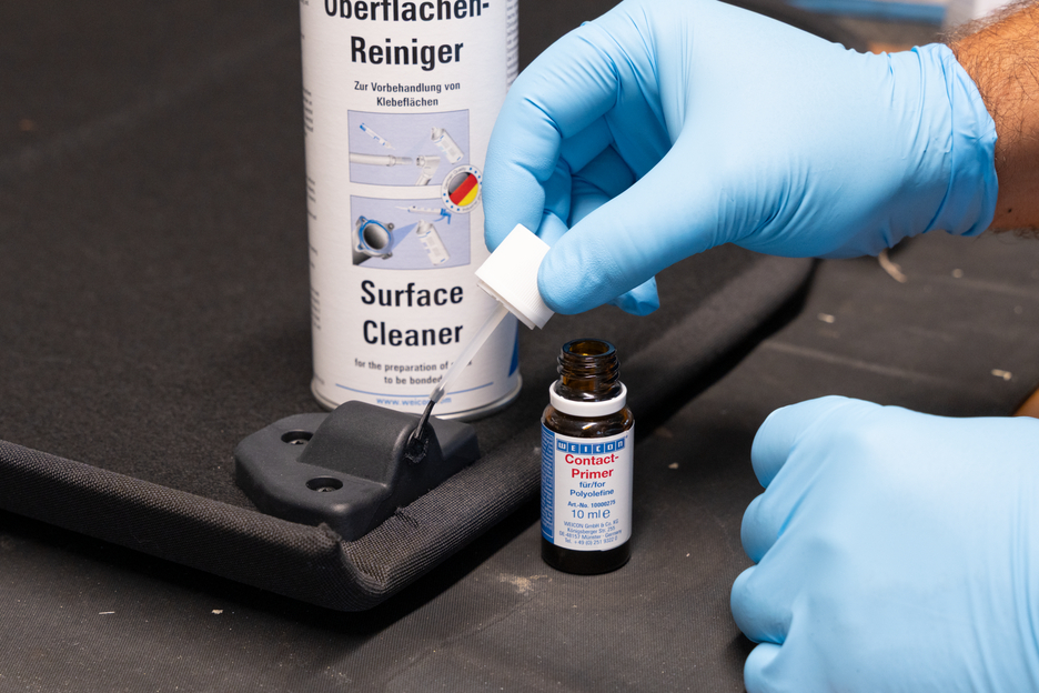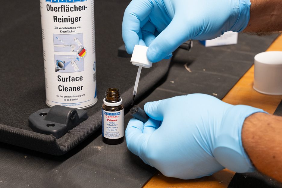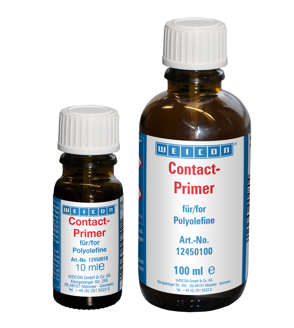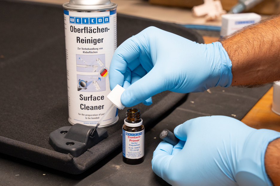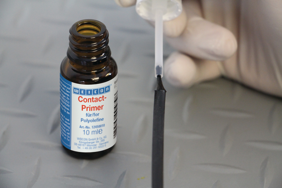 전처리가 없으면 많은 플라스틱은 접착이 불가능하거나 특정 조건에서만 접착이 가능합니다. 이러한 플라스틱을 WEICON 접촉 프라이머로 전처리하면 표면 구조가 달라집니다. 따라서 폴리올레핀 그룹에 속하는 폴리에틸렌(PE) 및 폴리프로필렌(PP)과 같은 소재의 결합이 가능해집니다. 실리콘뿐만 아니라 최신 열가소성 엘라스토머(TPE), PTFE 및 관련 플라스틱도 WEICON Contact Primer로 전처리하면 접착할 수 있습니다.