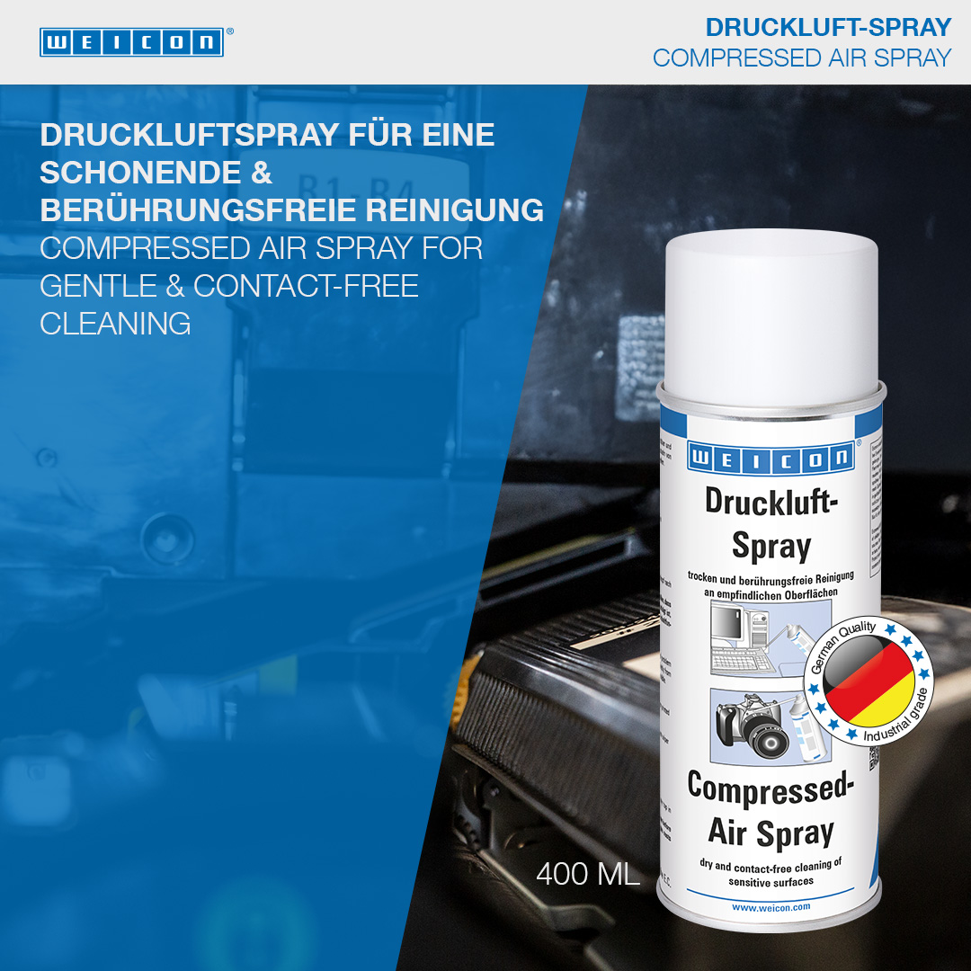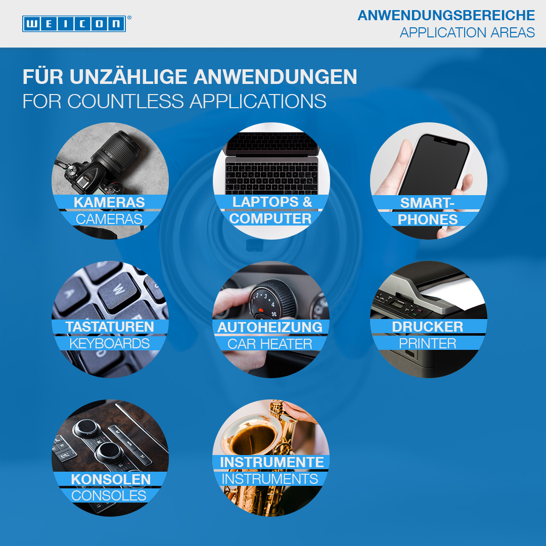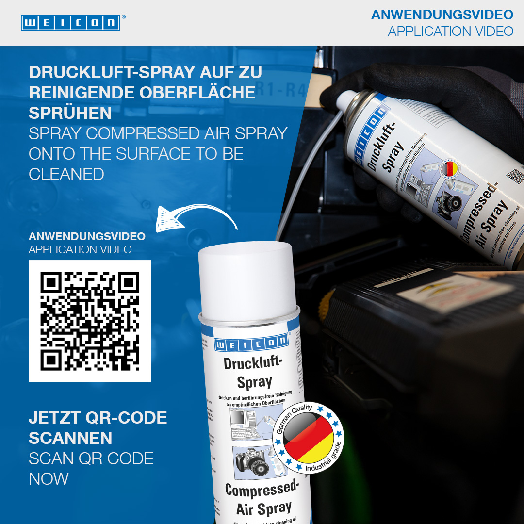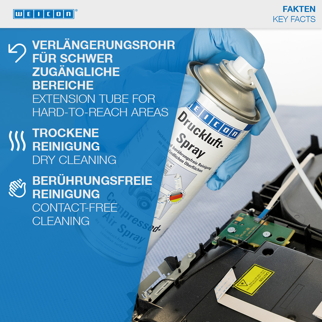 웨이콘 압축 공기 스프레이는 기존 방법으로는 먼지를 쉽게 제거할 수 없는 곳이나 손이 닿기 어려운 부품에 사용할 수 있습니다. 접근하기 어려운 구석이나 민감한 표면을 건조하고 비접촉식으로 청소할 수 있습니다. 압축 공기 스프레이는 하이파이 및 비디오 장치(예: 모듈, 회로 기판, 마그네틱 헤드, 하드 드라이브 등), 광학 장치(예: 카메라, 대물렌즈, 렌즈), 자동차 퓨즈 박스 및 와이퍼 장치, 시계(쿼츠 시계), 의료 기술, 모형 제작, 측정 기술, 전자 부품 및 회로 기판에서 사용할 수 있습니다.