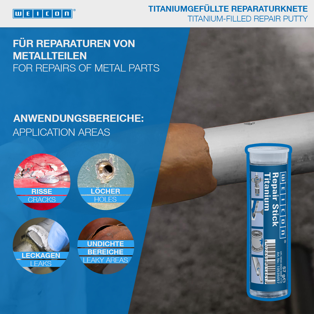 탱크 및 파이프 라인, 알루미늄, 경금속 및 사출 성형 부품, 샤프트 및 슬라이드 베어링, 펌프 및 하우징, 찢어진 나사산과 같은 금속 부품의 영구적이고 내마모성 있는 수리 및 접착에 적합합니다. WEICON 리페어 스틱 티타늄은 기계 및 시스템 건설, 탱크 건설 및 장치 엔지니어링, 기타 여러 산업 분야에서 사용할 수 있습니다.