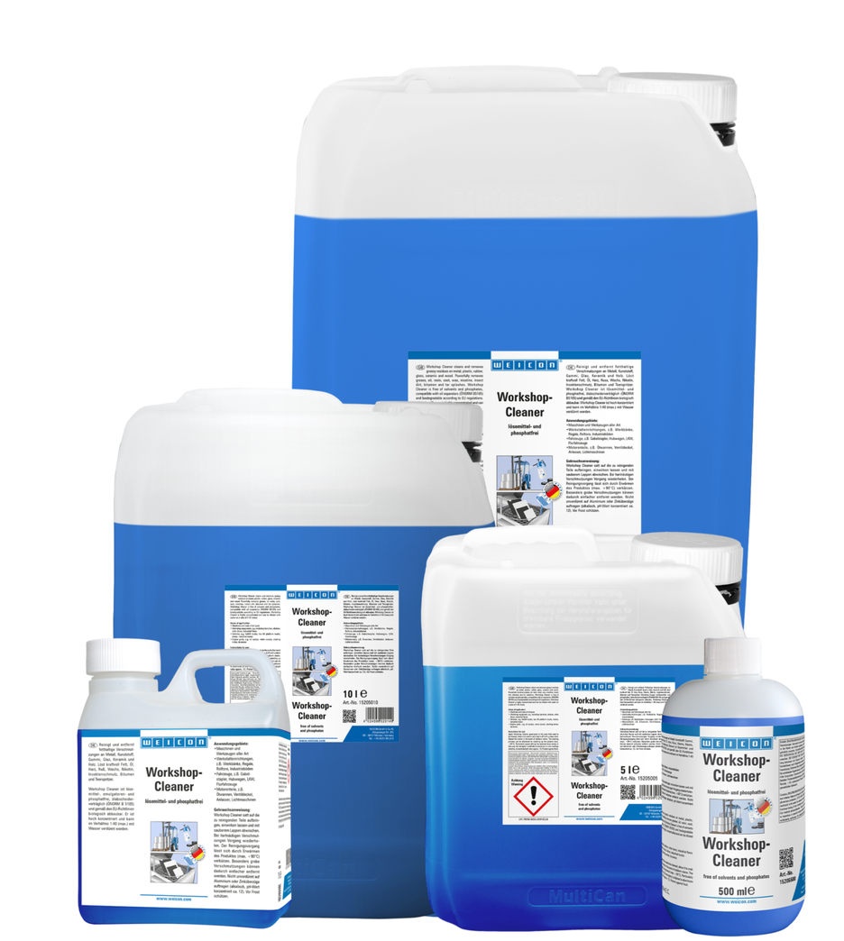 웨이콘 워크샵 클리너는 모든 금속, 플라스틱, 고무, 유리, 세라믹 및 목재를 세척하고 탈지합니다. 그리스, 오일, 수지, 그을음, 왁스, 니코틴, 벌레 때, 역청 및 타르 튄 자국을 강력하게 제거합니다. 워크샵 클리너는 용매, 유화제, 인산염이 없고 오일 분리기(ÖNORM B 5105)와 호환되며 EC 지침에 따라 생분해됩니다. 고농축으로 물과 1:40(최대)의 비율로 희석할 수 있습니다. 엄선된 거품이 없는 텐사이드가 포함되어 있으며 수동 세척 외에도 고압 세척기, 부품 세척기 및 스프레이 장치(예: 펌프 디스펜서 WPS 1500)에 사용할 수 있습니다.