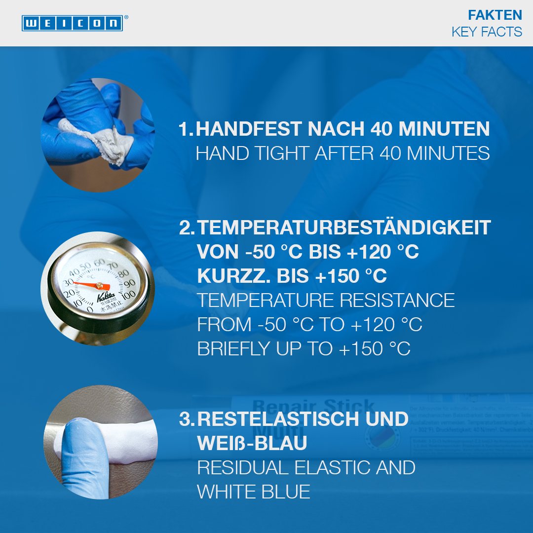웨이콘 리페어 스틱 플라스틱은 창문과 문틀, 판넬, 범퍼 바 등 잔류 탄성이 있는 플라스틱 부품과 복합재료를 영구적으로 수리하기 위해 특별히 개발되었습니다. 파이프 및 파이프 벤드, 피팅 및 플랜지, 물 탱크, 펌프 및 하우징과 같은 금속 조각을 접착하는 데 적합합니다. 리페어 스틱은 탱크 건설 및 장치 엔지니어링, 식품, 화장품, 제약 산업 및 기타 여러 분야에서 사용할 수 있습니다.