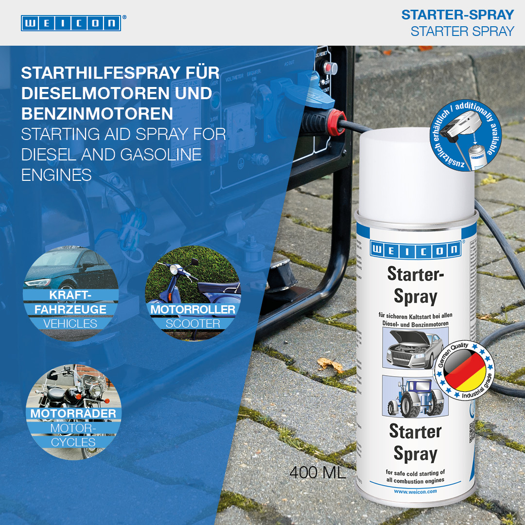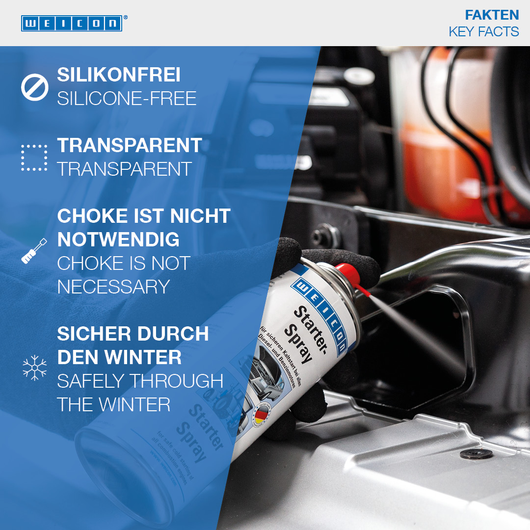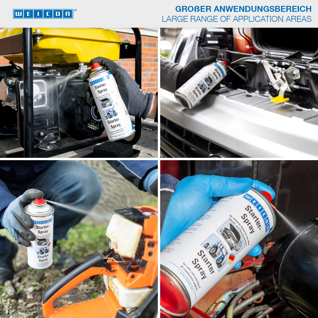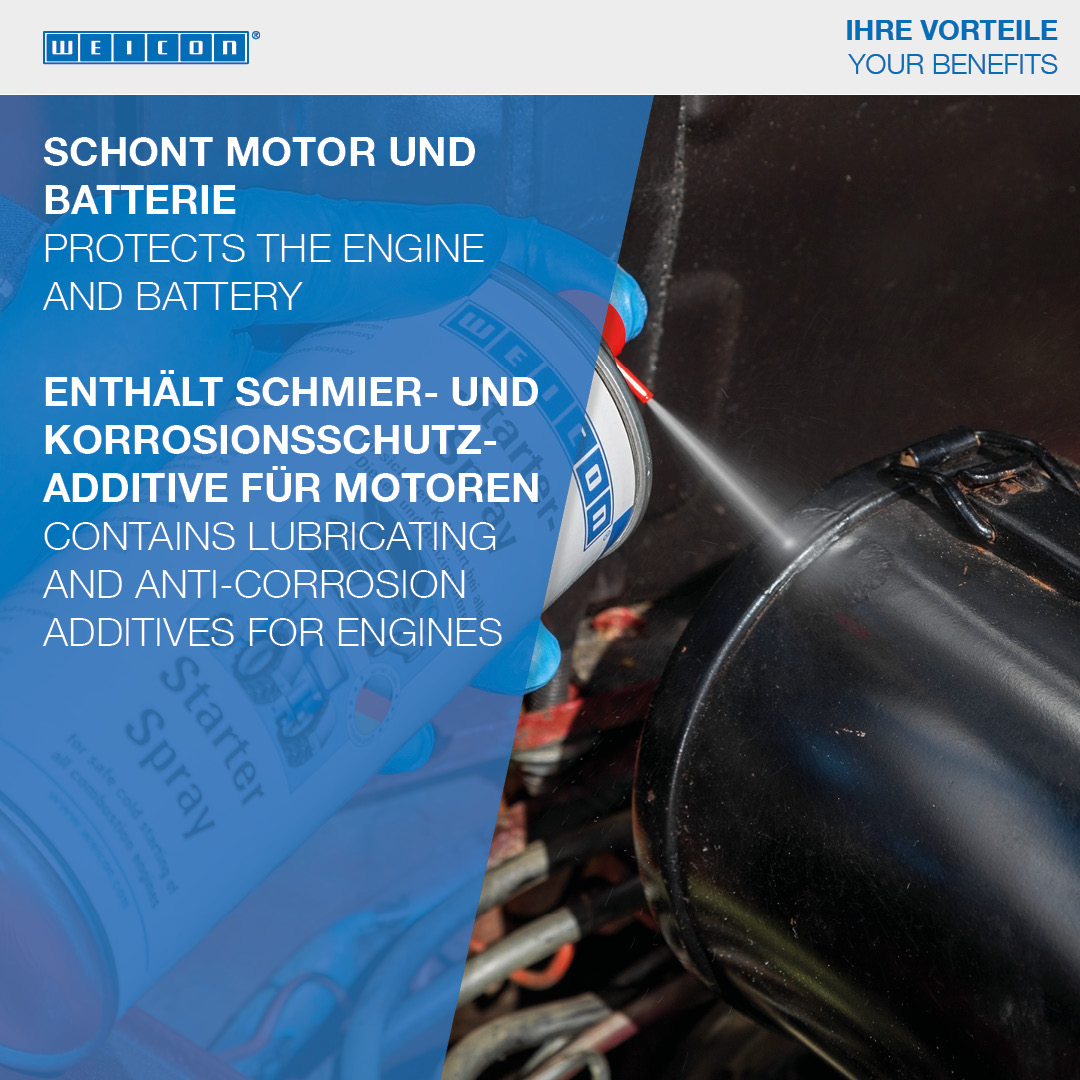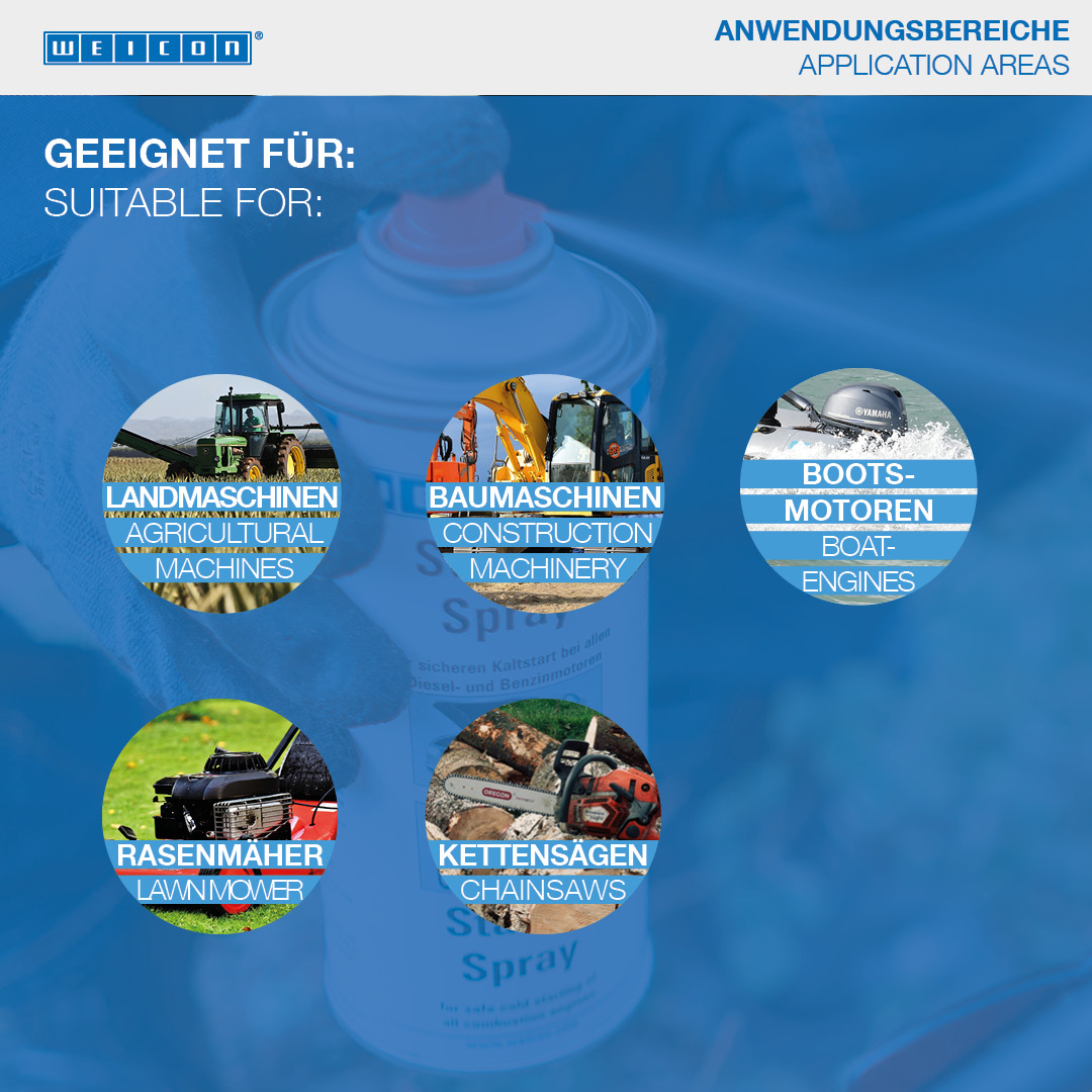 웨이콘 스타터 스프레이는 연소 엔진의 쉽고 안전한 시동을 위해 적합합니다. 모든 엔진의 안전한 콜드 시동은 특별한 성분 조합을 통해 가능합니다. 스타터 스프레이는 저온, 습한 날씨 또는 엔진 가동 중단 시간이 길어질 때 이상적입니다. 이렇게 하면 엔진과 배터리를 모두 보호할 수 있습니다. 웨이콘 스타터 스프레이는 디젤 엔진과 가솔린 엔진 모두에 적합합니다. 자동차, 건설 기계, 농기계, 체인톱, 잔디 깎는 기계, 보트 엔진, 오토바이, 스쿠터 등 촉매 컨버터의 유무와 관계없이 사용할 수 있습니다.