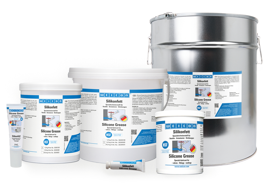 웨이콘 실리콘 그리스는 접착력이 뛰어나고 투명하며 플라스틱과 매우 잘 호환됩니다. NSF H1 등록으로 민감한 부위의 밸브, 피팅 및 씰용 윤활유로 적합합니다. 이 그리스는 독일 연방 환경청의 식수와 접촉하는 유기 물질의 위생 평가 지침(KTW 지침)을 준수합니다. 식음료 산업, 위생 및 난방 공사, 제약 산업, 씰링 기술 분야에서 사용할 수 있습니다. WEICON 실리콘 그리스는 독일 연방 재료 연구 및 시험 연구소(BAM)에서 안전성 테스트를 거쳤습니다(BG RCI의 리플렛 034-1 "산소 사용 비금속 재료 목록"(DGUV 정보 213-075) 참조). 이 그리스는 특히 재료 친화적이고 무취 및 무미이며 -50°C ~ +200°C의 온도 저항성을 가지고 있습니다. 웨이콘 실리콘 그리스는 플라스틱 부품, 고무 부품 및 씰, 밸브, 피팅 및 개스킷, 장치 및 시스템의 윤활 및 오링용 조립 보조제로 적합합니다.