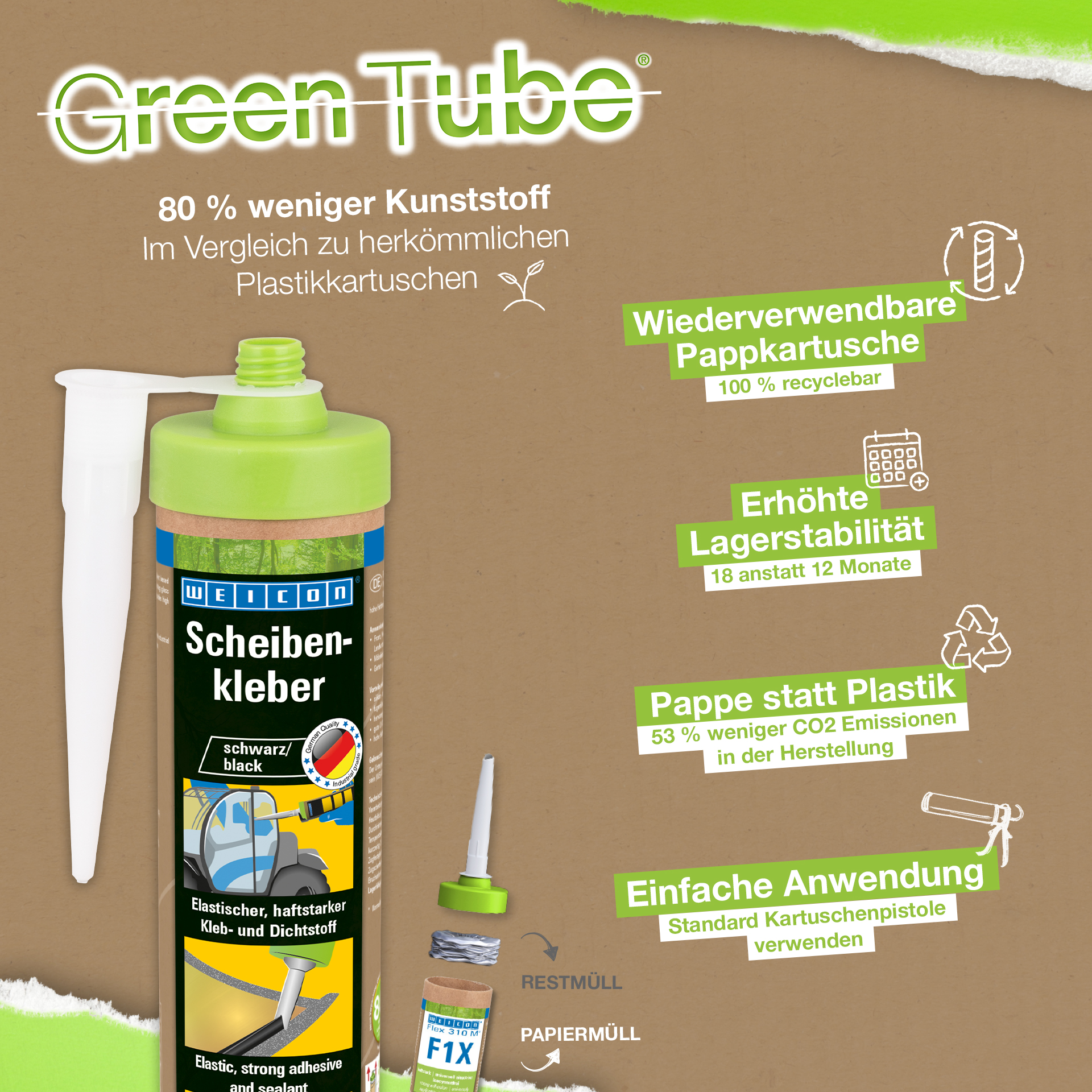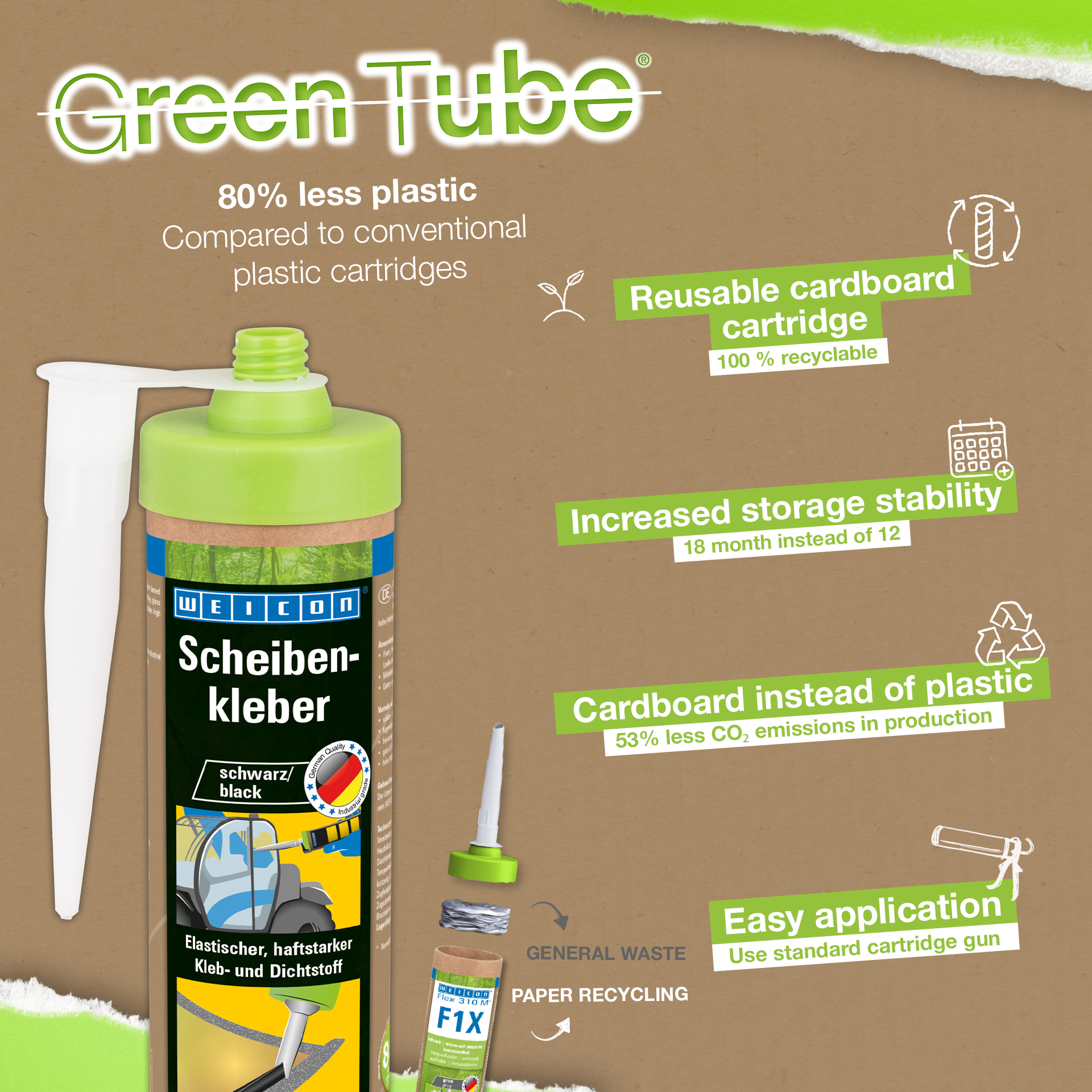 웨이콘 윈드스크린 접착제는 탄력 있고 끈적끈적하며 강력한 1-C 접착제 및 실란트로, 특별히 유리와 유리창을 장착하도록 설계되었습니다. 예를 들어 이 접착제는 전동식 산업용 트럭, 농기계, 건설 기계의 앞유리, 뒷유리, 측면 유리창을 접착합니다. 또한 가구 제조나 원예 및 조경용 설치에도 적합합니다. 윈드스크린 접착제는 다양한 소재에 높은 접착 강도를 제공하며 공기 습도에 따라 경화됩니다. 이 접착제는 우수한 노화 저항성과 우수한 자외선 안정성을 보여줍니다. 이음매가 없고 무취이며 실리콘, 이소시아네이트, 할로겐 및 용매를 함유하지 않습니다.