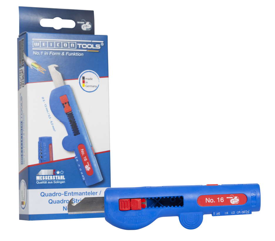 8~13mm ø의 모든 일반 원형 케이블 피복, 후크 블레이드 및 피복 범위가 통합되어 있습니다. 하우징에 최적화된 케이블 라우팅으로 빠르고 쉬운 종방향 절단. 단면적이 0.5mm², 0.75mm², 1.5mm², 2.5mm², 4.0mm², 6.0mm²인 모든 연선 및 단선에 대한 피복 범위가 통합되어 있습니다. 접이식 후크 블레이드는 어느 위치에서나 단단히 잠글 수 있고 쉽게 교체할 수 있습니다.