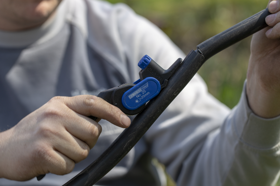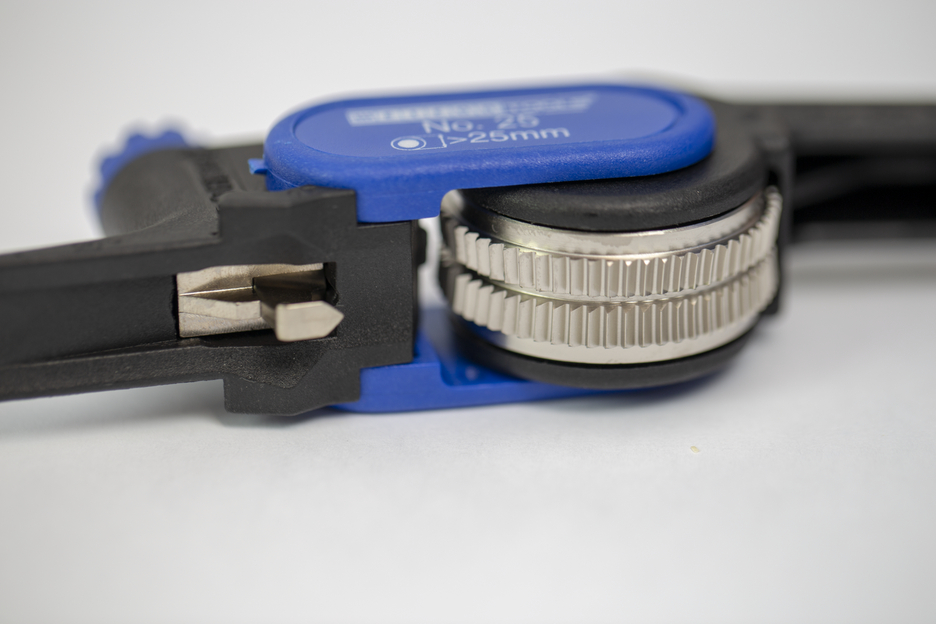 해체 공구 25번은 최대 5mm 피복 두께의 케이블을 벗겨내기 위해 설계되었습니다. 이 칼은 세로 절단과 원형 절단 모두에 사용할 수 있습니다. 원형 절단은 외경이 25mm 이상인 케이블에서 수행할 수 있습니다. 외부 피복 절단은 작은 레버 움직임과 동시에 톱니를 피복에 대고 눌러서 수행합니다. 이 도구는 충격에 강한 폴리아미드 본체에 양날이 삽입된 칼날과 기어 휠이 연결되어 있습니다. 케이블 끝에서 작업을 수행하든 중간 피복에서 작업을 수행하든 상관없이 케이블 외피에서 세로 및 원형 절단을 안전하게 수행할 수 있습니다. 절단 깊이는 조정 헤드를 돌리기만 하면 0에서 5mm까지 0.1mm 단위로 조정할 수 있습니다(0.1mm의 디텐트를 통해). 칼날의 모양 덕분에 알루미늄 실드를 포함한 외부 피복을 최대 5mm 두께까지 기본 층을 손상시키지 않고 벗겨낼 수 있습니다. 매우 낮은 온도(-10°C)에서도 문제 없이 작업을 수행할 수 있습니다. 공구의 칼날은 경도가 최소. 48 HRC이며 쉽게 교체할 수 있습니다;