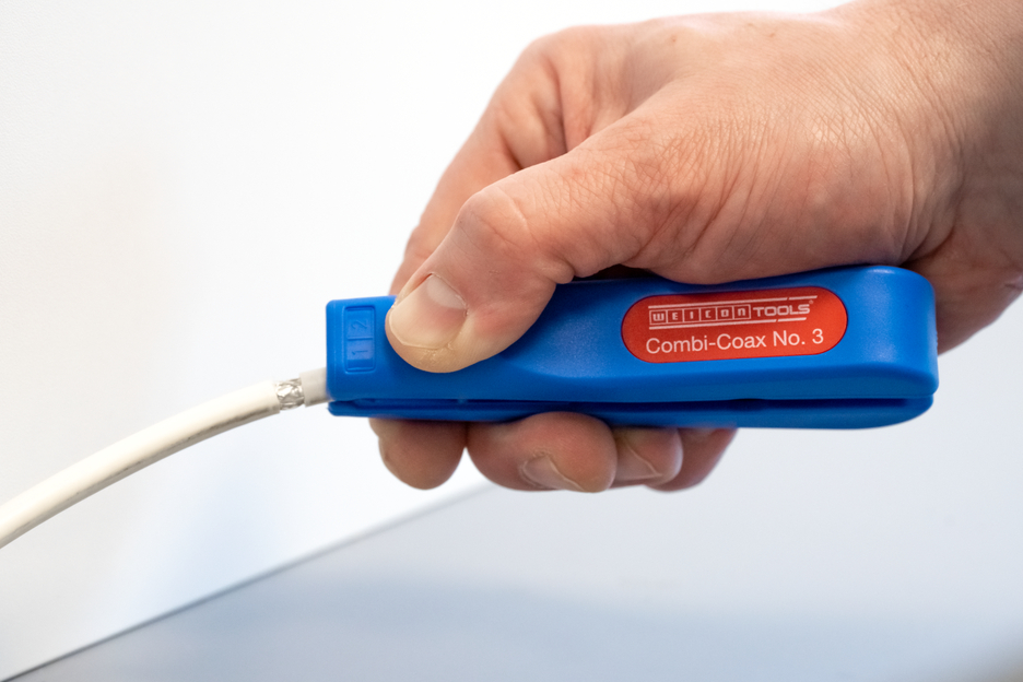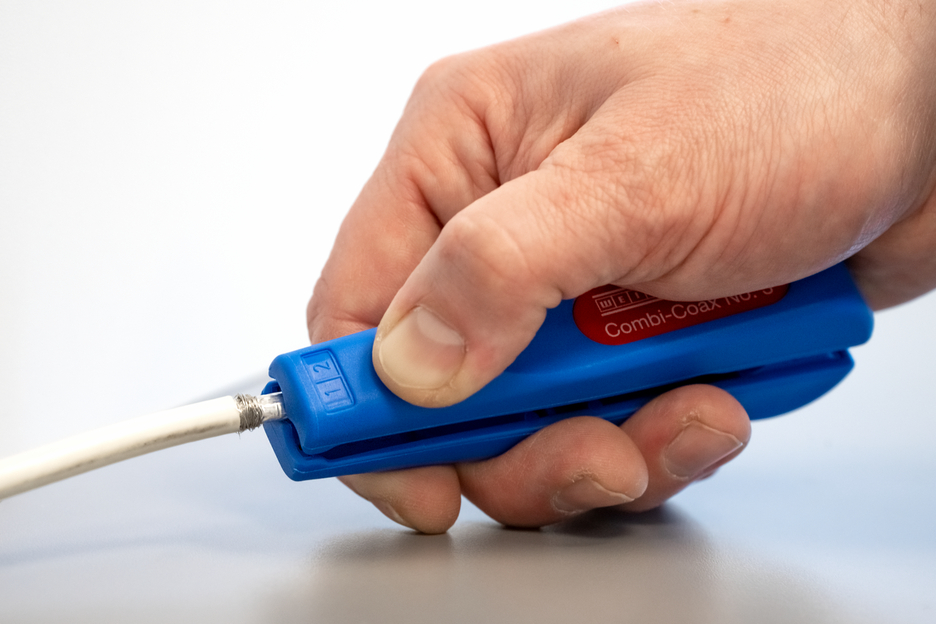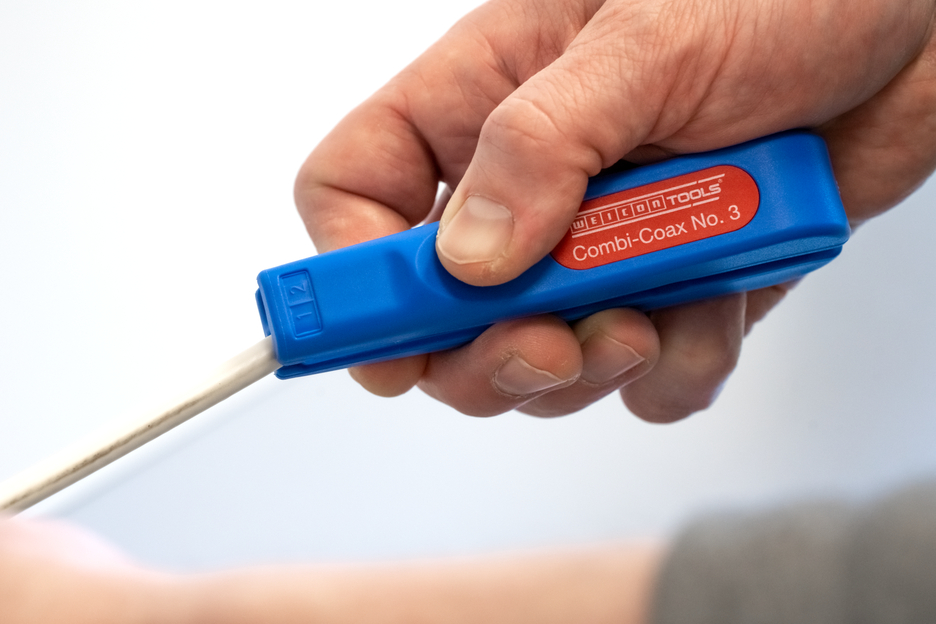 Combi-Coax 3번을 사용하면 모든 일반 동축 케이블, NYM 케이블 및 연성 케이블을 단계별로 피복 제거할 수 있습니다. 절단 깊이를 수동으로 조정할 필요가 없습니다. Combi-Coax 3번은 직경 4.8 - 7.5 mm의 동축 케이블, 3 x 0.75 mm²의 NYM 케이블, 10 및 16 mm²의 플렉시블 케이블을 피복합니다. 또한 Combi-Coax 3호에는 최대 직경 8 mm의 케이블을 쉽게 절단할 수 있는 측면 절단기가 있습니다. 피복제거기를 사용할 때 피복제거 중에 정확한 절단 패턴이 표시됩니다. 예를 들어, 동축 케이블의 첫 번째 피복은 스트리퍼의 칼을 사용하여 A면으로 제거한 다음 B면으로 내부 도체를 벗길 수 있습니다.