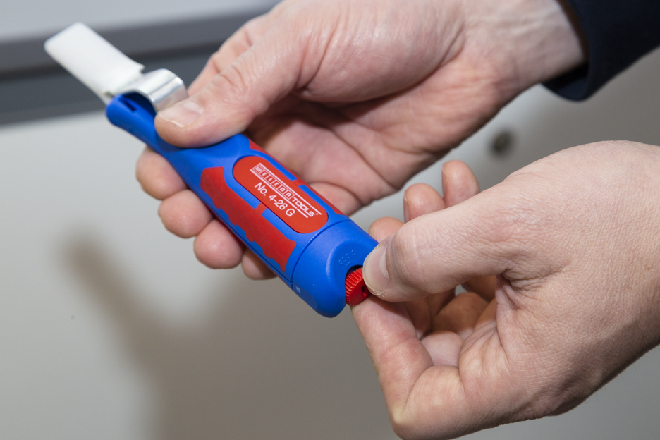 무한 가변 및 조작이 쉬운 조절 휠 자동 회전 I 내부 블레이드 회전 I 정확하고 빠르고 안전한 스트리핑 I 작업 범위 4 - 28 mm Ø I 인체공학적 형태의 멀티 컴포넌트 핸들