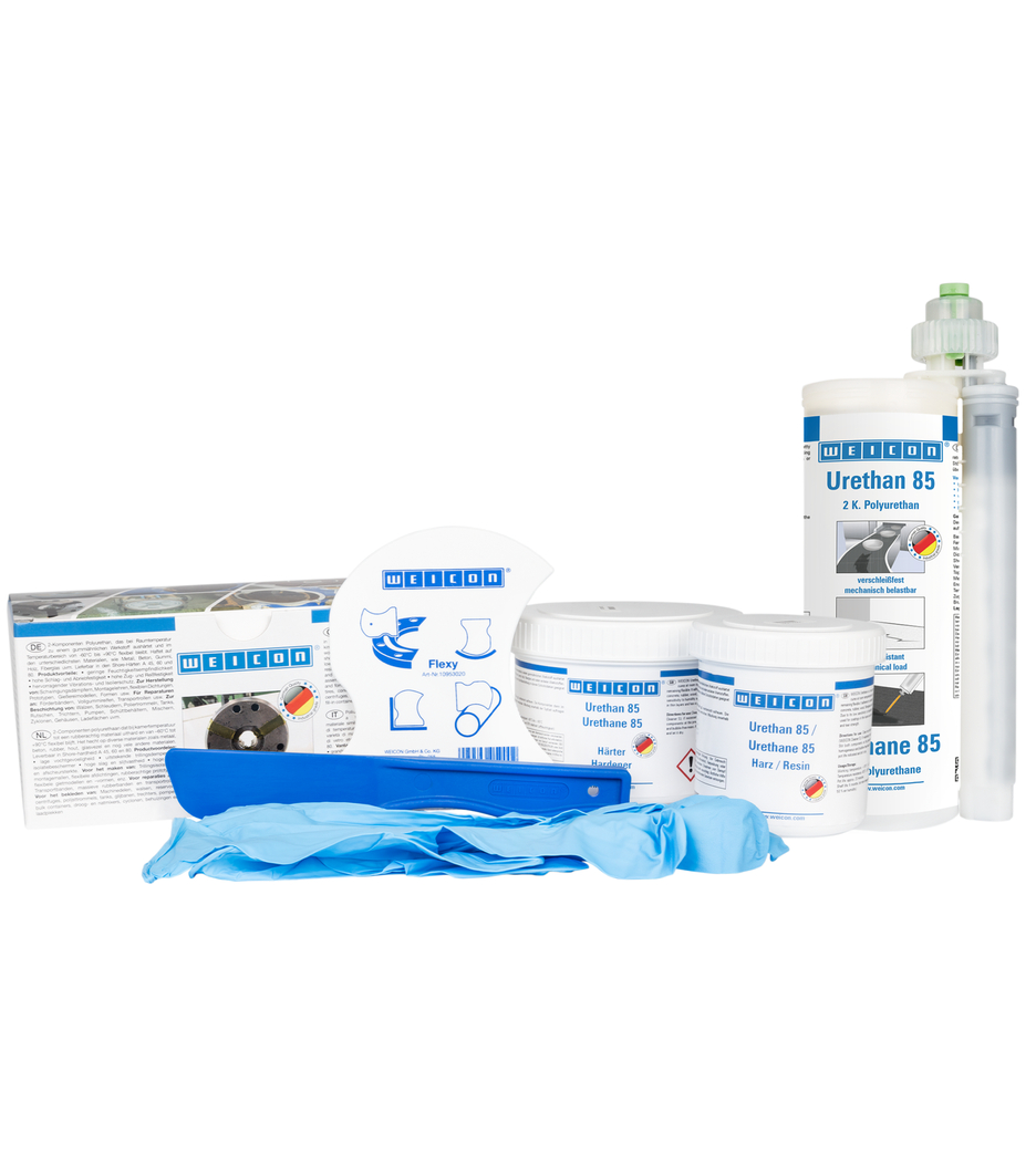 웨이콘 우레탄 85는 충격, 마모, 진동 또는 움직임에 노출된 고무 및 금속 조각의 빠른 수리, 터치업 및 코팅을 위한 우수한 기계적 강도를 가진 2-C 폴리우레탄 퍼티입니다. 높은 탄성뿐만 아니라 높은 내마모성을 보여줍니다. 우레탄 85는 고무 부품 및 컨베이어 벨트 수리, 고무 코팅의 수리 및 터치업, 펌프 하우징 및 임펠러의 유연한 마모 방지, 마모된 씰 및 고무 롤러의 빠른 수리 등 다양한 용도에 적합합니다.