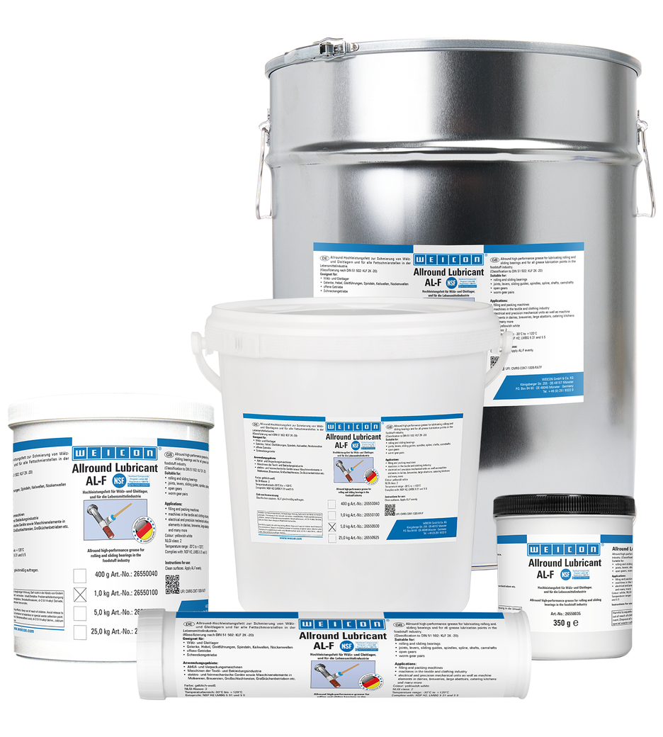 WEICON AL-F는 롤러 및 슬라이드 베어링, 조인트, 레버, 슬라이딩 가이드, 스핀들, 스플라인 샤프트, 캠샤프트, 오픈 기어, 웜 기어 및 모든 그리스 윤활 지점을 윤활하는 데 사용할 수 있습니다. NSF 승인 H2를 받은 이 그리스는 식품 산업에서 사용하기에 적합합니다.