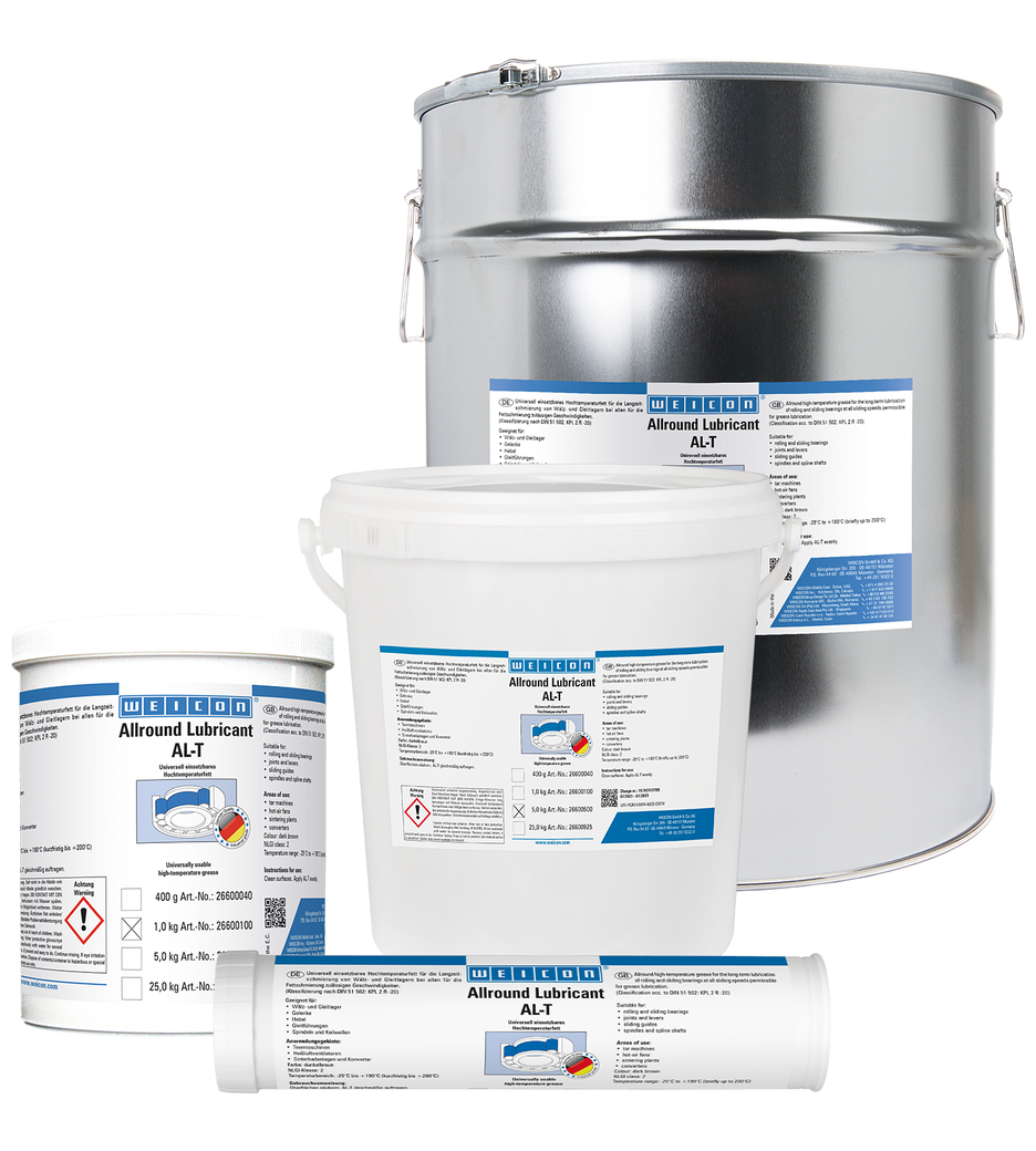 WEICON AL-T는 롤러 및 슬라이드 베어링, 조인트, 레버, 슬라이딩 가이드, 스핀들, 스플라인 샤프트 및 그리스 윤활에 허용되는 모든 슬라이딩 속도에 적합합니다. AL-T는 다양한 산업 분야에서 사용할 수 있습니다.