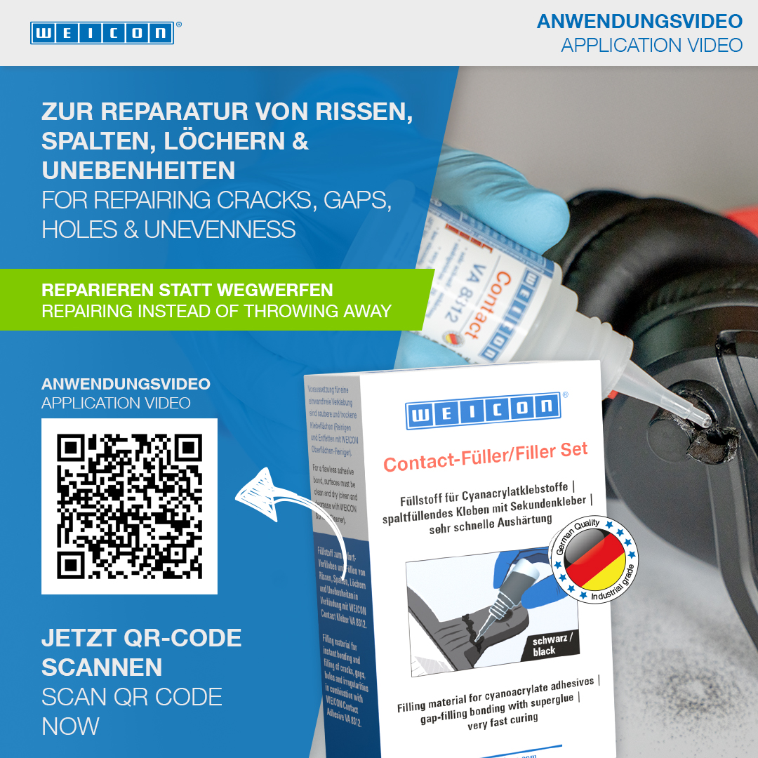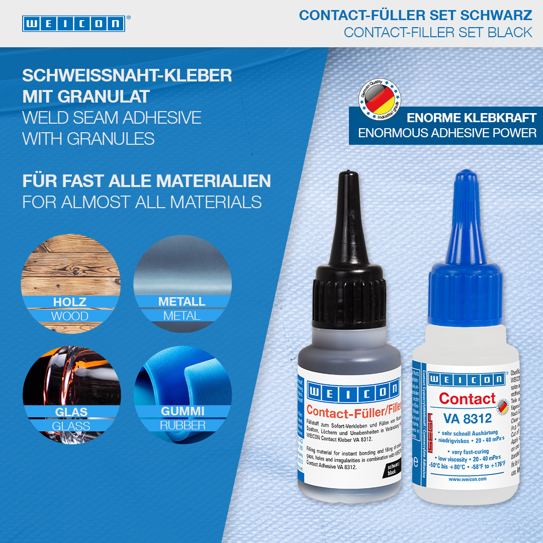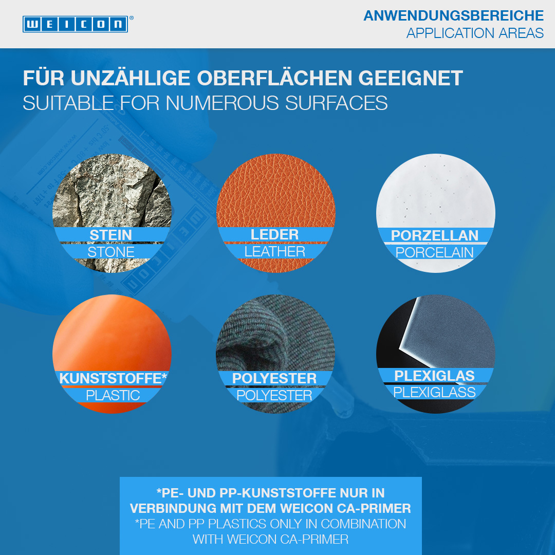 WEICON Contact VA 8312는 솔리드 고무 또는 셀룰러 고무, 플라스틱 및 EDPM 엘라스토머와 같은 다양한 고무 소재의 접착에 적합합니다. WEICON CA-Primer와 함께 사용하면 폴리올레핀(PE-폴리에틸렌, PP-폴리프로필렌)에도 VA 8312를 사용할 수 있습니다. WEICON Contact Filler와 함께 사용하면 VA 8312는 균열, 갈라진 틈, 구멍 및 고르지 않은 표면을 즉시 접착하고 메우는 데 적합합니다.