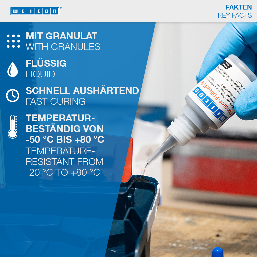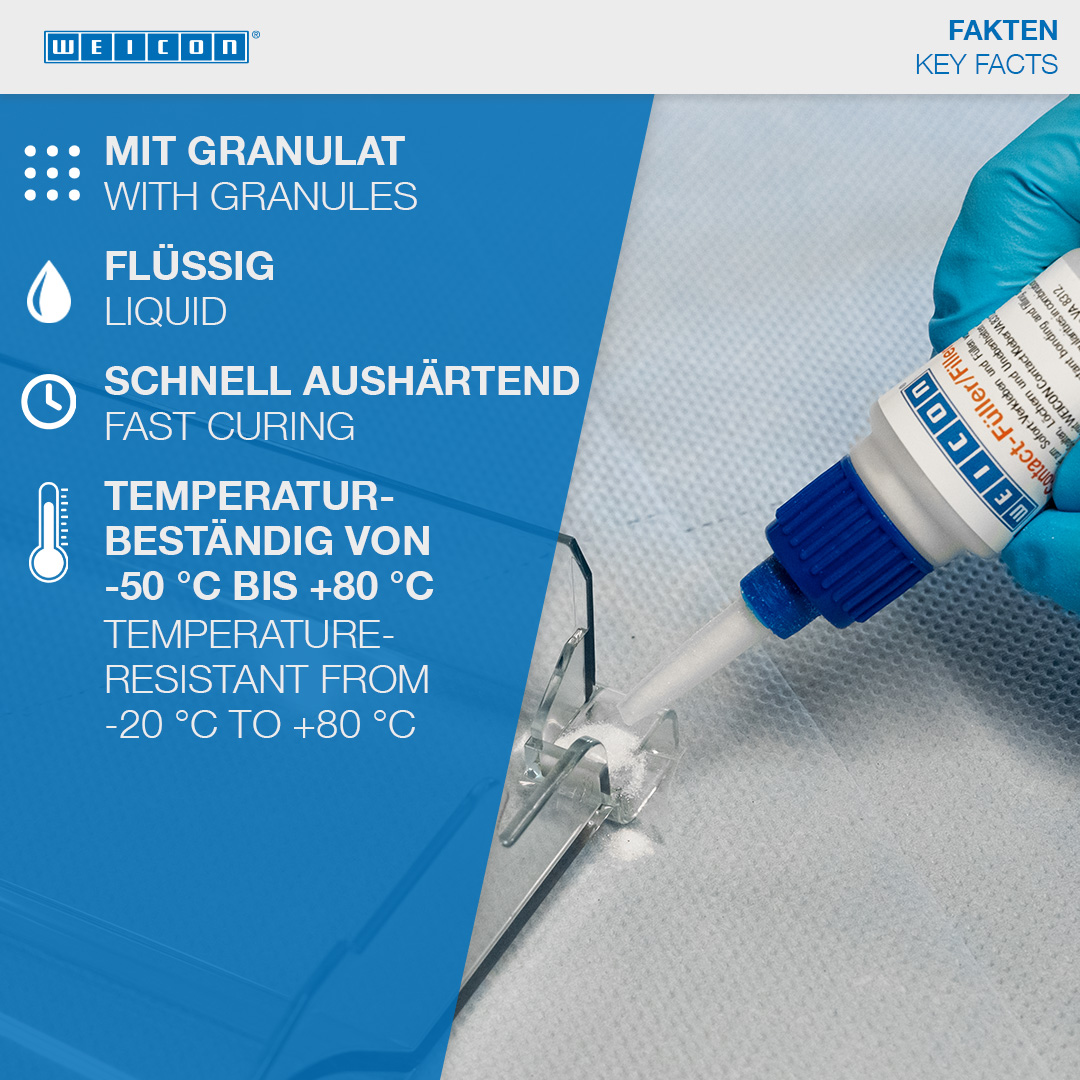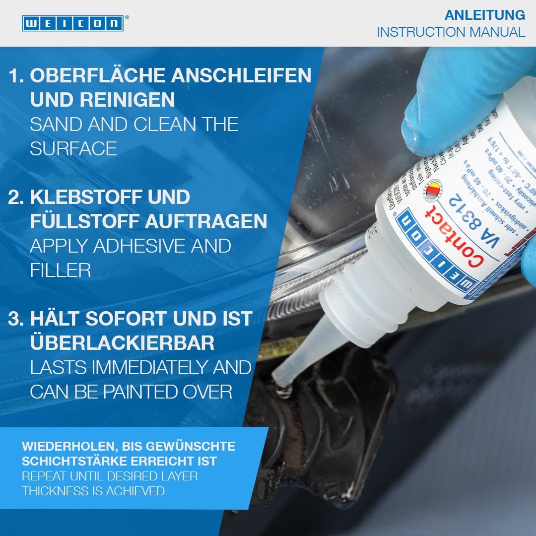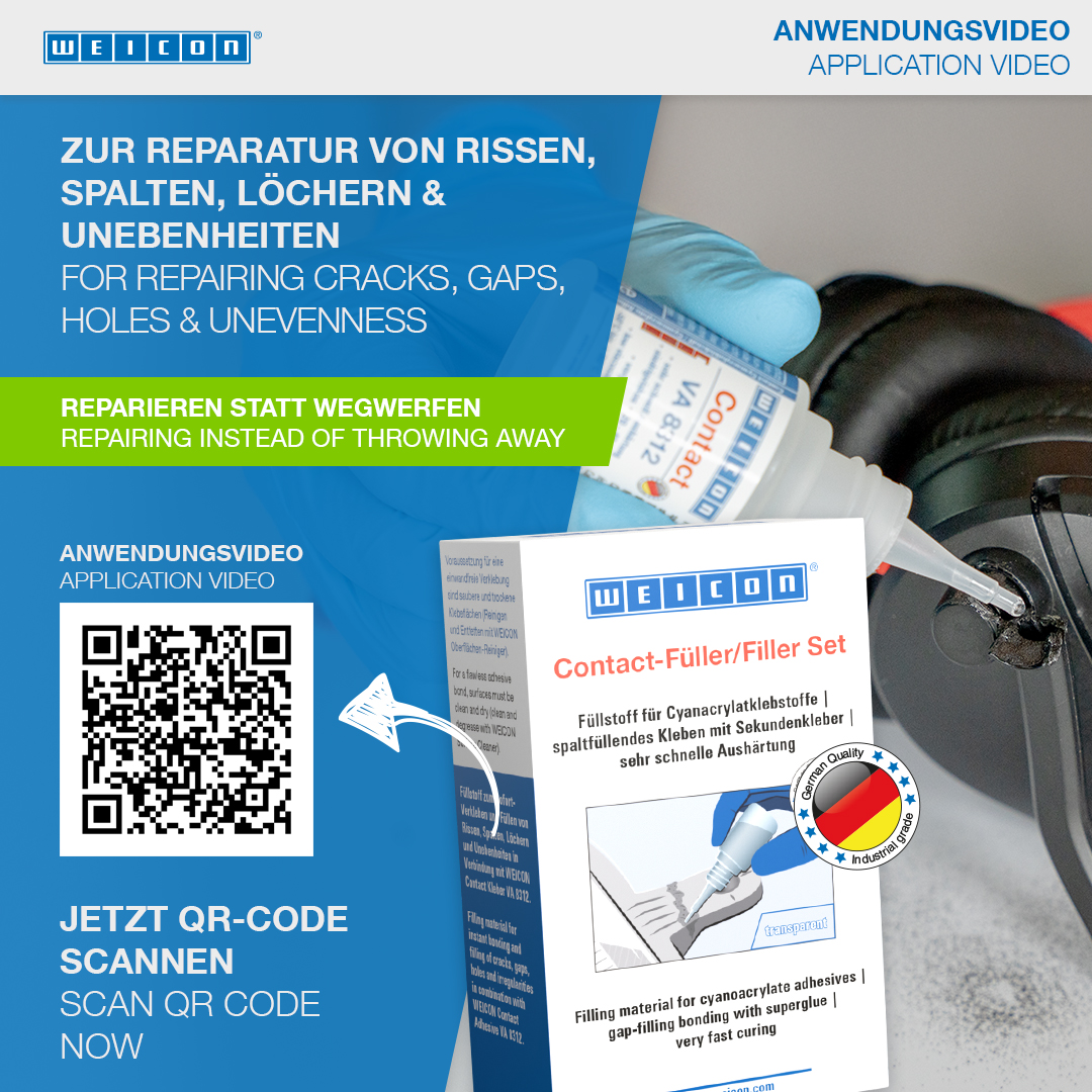 WEICON Contact VA 8312는 솔리드 고무 또는 셀룰러 고무, 플라스틱 및 EDPM 엘라스토머와 같은 다양한 고무 소재의 접착에 적합합니다. WEICON CA-Primer와 함께 사용하면 폴리올레핀(PE-폴리에틸렌, PP-폴리프로필렌)에도 VA 8312를 사용할 수 있습니다. WEICON Contact Filler와 함께 사용하면 VA 8312는 균열, 갈라진 틈, 구멍 및 고르지 않은 표면을 즉시 접착하고 메우는 데 적합합니다.