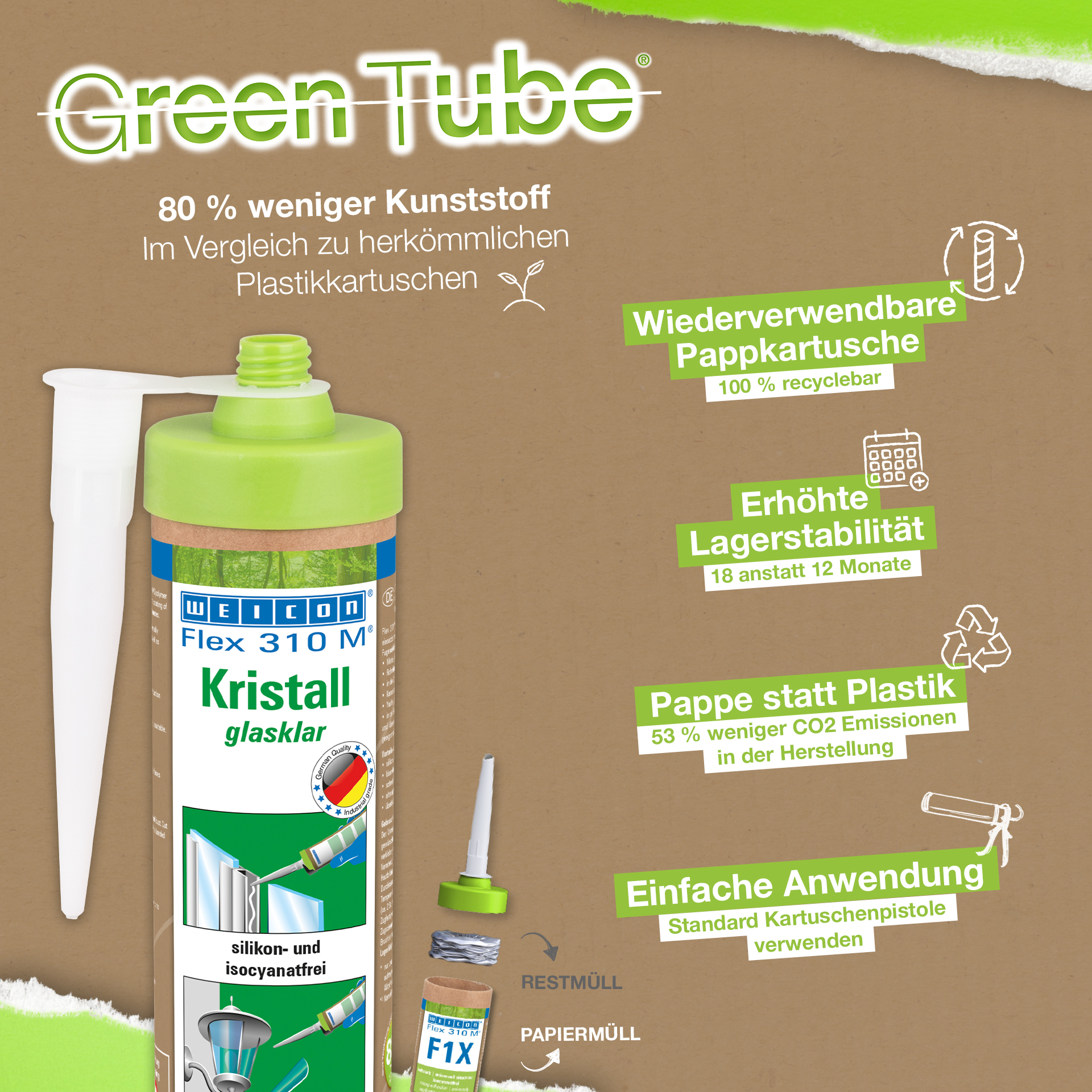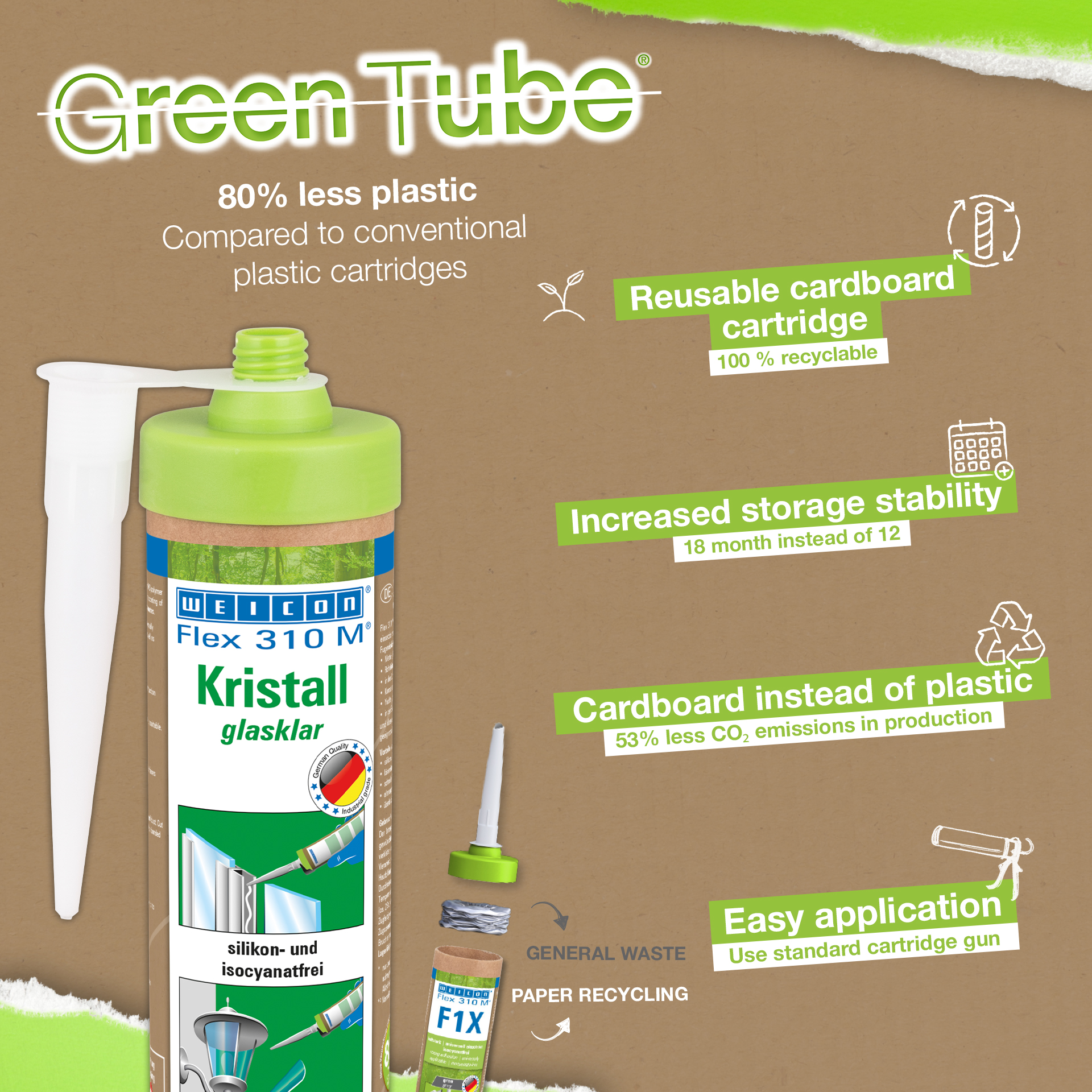 웨이콘 플렉스 310 M 크리스탈은 투명하고 강하며 페인트칠(습식 도장)이 가능하고 샌딩이 가능하며 노화에 대한 저항성이 뛰어나고 자외선에 대한 내성이 우수합니다. 실리콘, 이소시아네이트, 할로겐 또는 용제를 함유하지 않습니다. ISEGA 인증을 받았으며 식품 기술 분야에서 접착제로 사용할 수 있습니다. Flex 310 M Crystal은 유리, PC* 및 아크릴 유리*, 금속, 각종 플라스틱, 세라믹, 목재 및 석재를 접착하는 데 적합한 탄성 접착제입니다. 이 제품은 경화 후 투명하며 특히 접착제가 보이지 않아야 하거나 보이지 않아야 하는 탄성 조인트에 적합합니다. 플라스틱 가공, 금속 건축, 탱크 및 장치 엔지니어링, 환기 및 공조 시스템, 전기 및 조명 산업, 전시 스탠드 제작 및 매장 설치, 실리콘 또는 실리콘이 포함된 제품이 적합하지 않은 모든 응용 분야에 사용할 수 있습니다. (* = 무텐션 본딩에만 해당)
