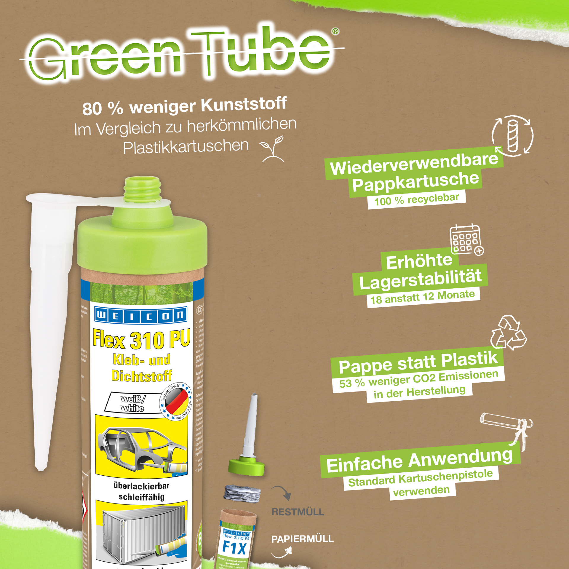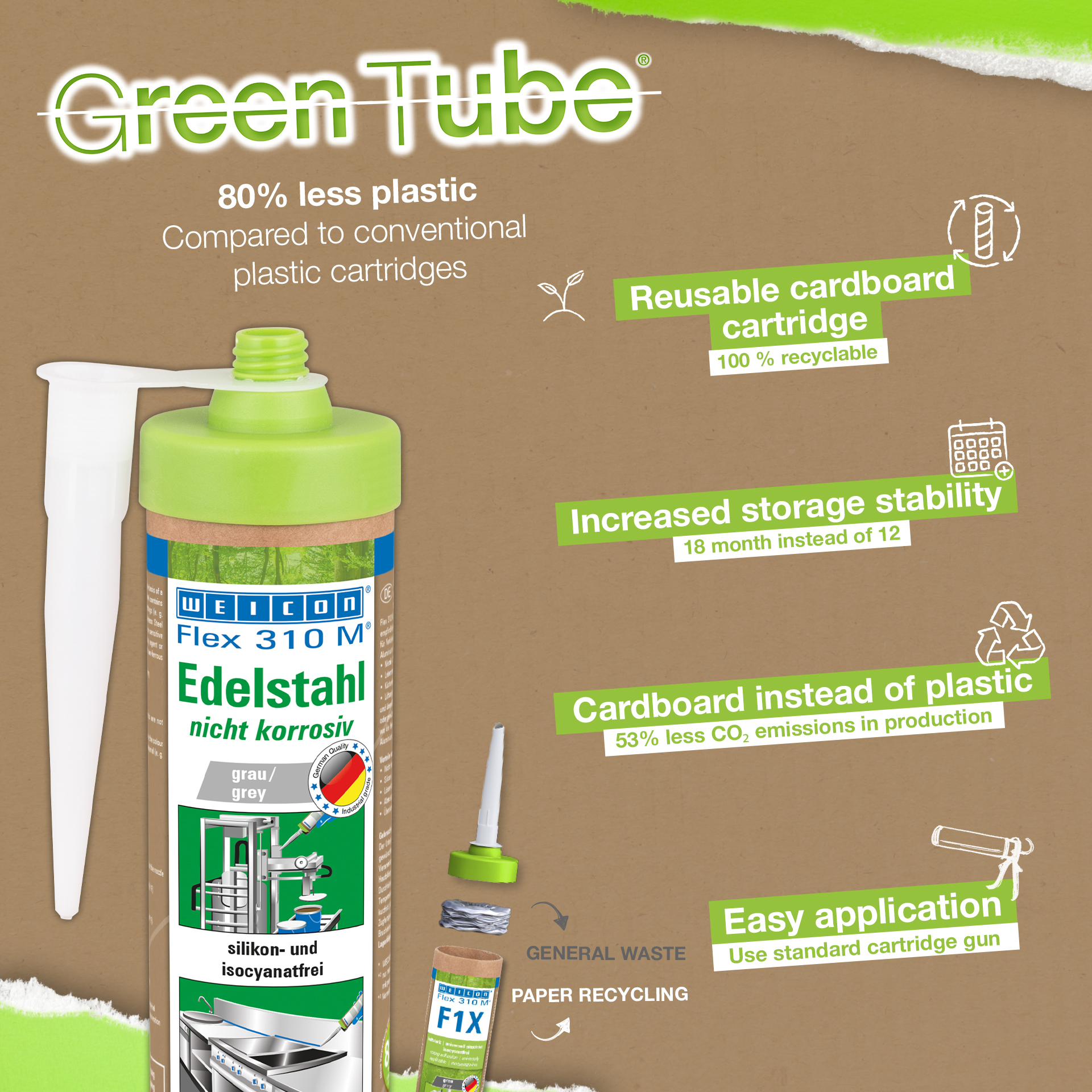 WEICON Flex 310 M 스테인리스 스틸 실란트는 비부식성, 강성, 도장 가능(습식), 샌딩 가능, 노화 및 자외선에 강하며 실리콘, 이소시아네이트, 할로겐 또는 용매가 함유되지 않은 제품입니다. 이 제품은 ISEGA 인증을 받았으며 식품 기술 분야에서 접착제로 사용할 수 있습니다. Flex 310 M 스테인리스 스틸은 MS 폴리머 기반의 탄성 접착제로 스테인리스 스틸, 알루미늄 및 비철금속과 같은 금속의 이음새 및 조인트 밀봉뿐만 아니라 접착에도 적합합니다. 또한 접착제와 실런트의 색상이 표면 소재(예: 스테인리스 스틸, 알루미늄 등)와 일치해야 하는 모든 적용 분야에 사용할 수 있습니다. WEICON Flex 310 M 스테인리스강은 금속 건축, 탱크 및 장치 엔지니어링, 식품 산업, 주방 및 위생 설비, 환기 및 공조 시스템, 실리콘 또는 실리콘 함유 제품이 적합하지 않은 모든 적용 분야에 사용할 수 있습니다.