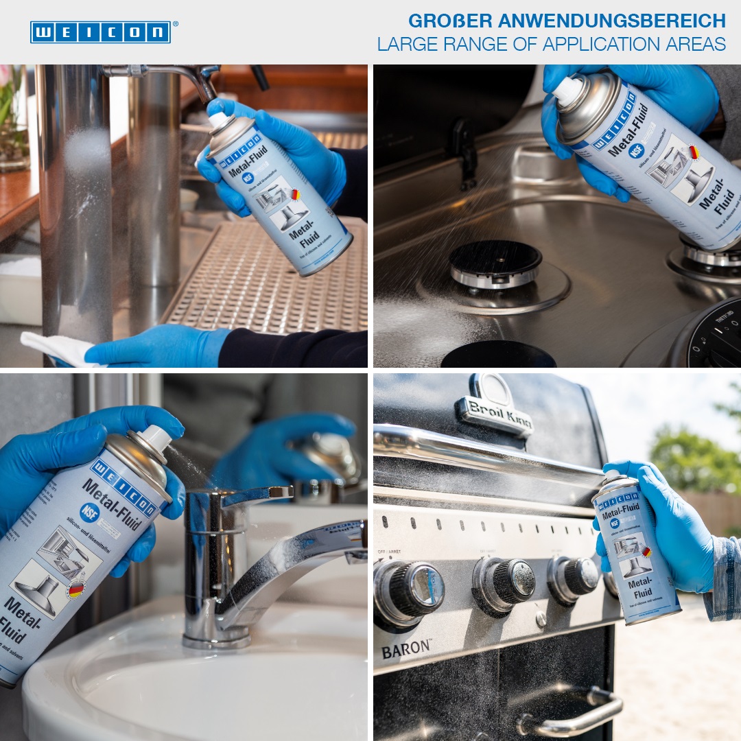 웨이콘 메탈-플루이드는 실내 무광택 및 광택 표면을 위한 관리 및 세척 제품으로 NSF에 등록되어 있습니다. 메탈-플루이드는 세라믹, 목재, 유리, 플라스틱뿐만 아니라 금속 표면을 보호, 세척, 관리합니다. 에칭 및 인쇄된 표시나 플라스틱 표면, 고무 씰은 녹이지 않습니다.