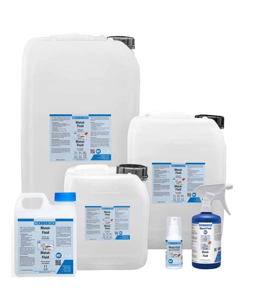 WEICON 메탈-플루이드는 실내 무광택 및 광택 표면을 위한 관리 및 세척 제품으로 NSF 승인을 받았습니다. 메탈-플루이드는 세라믹, 목재, 유리, 플라스틱뿐만 아니라 금속 표면을 보호, 세척, 관리합니다. 에칭 및 인쇄된 표시나 플라스틱 표면, 고무 씰은 녹이지 않습니다.
