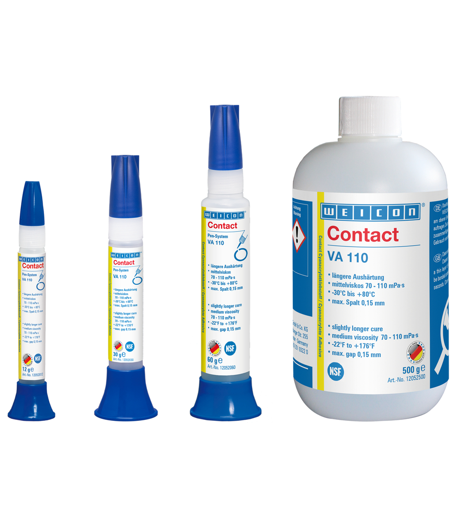 WEICON VA 110은 제약 산업, 화장품 제조, 식품 산업 또는 고무와 플라스틱을 접착하는 장난감 제조와 같은 민감한 영역에서 사용할 수 있는 NSF 등록 시아노 아크릴레이트 접착제로, 고무와 플라스틱을 접착하는 데 사용됩니다.